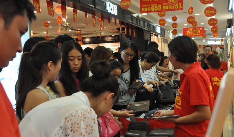 “讓一讓,勞駕讓一讓”,摩肩接踵的人流中,不時傳出這樣的叫喚,循著聲音望去,一個穿著工作服的小伙子抱著個大紙箱,上面貼著大搶節(jié)特供品字樣,在人群中艱難的穿行。“簡直和春運(yùn)一樣”,看到記者,這位營業(yè)員這樣描述,盡管商場內(nèi)空調(diào)溫度很低,很涼爽,營業(yè)員竟然滿頭大汗。“柜臺上備的貨一下子就搶完了,趕緊從倉庫取”,小伙子說完這句話,一蹦一跳的穿過人群,已經(jīng)不見了蹤影。這才剛剛開始啊,還有十天十夜,小伙子的“體力活”看來還要干很久。