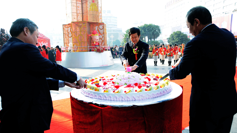項領總經理講話結束后,一塊直徑1米印有“華億國際十二周歲生日快樂”字樣的巨型蛋糕被緩緩推進慶典現場,項義水董事長、顧踴躍副總裁、陳東吉顧問共同切開蛋糕,與廣大員工共同分享。同時,禮炮齊鳴,彩球騰飛,廣場上一片歡騰。