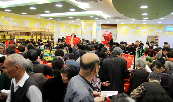上午8時,華億生活超市徽商春天店門前人山人海,超市會員卡辦理區排起了長長的隊伍,超市外的特惠商品區域吸引了不少購物者。在簡短的開業剪彩儀式后,數百名消費者涌進超市,一時間一樓的生鮮區、酒水區、冷凍冷藏區,二樓的日用百貨區,購物人群摩肩接踵,不少消費者將購物籃高高舉起頂在頭上以便走動。開業數分鐘后,收銀臺排起了付款長龍。華億生活超市的每一位員工堅守自己的崗位,現場火爆且秩序井然。