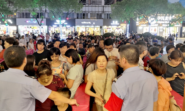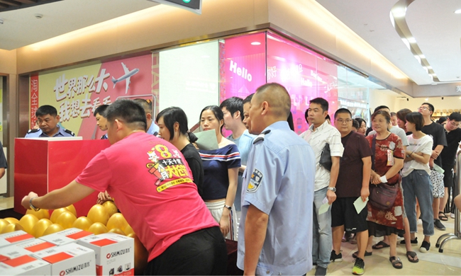 晚上6:30分,華億國際購物中心B座西門廣場客流不斷聚集,排隊等待入場,數(shù)名安保人員在門前維持秩序,玻璃門上掛著寫有“大搶節(jié)活動晚上7時開啟”字樣的KT板,提醒消費者正式進入商場的時間。熟悉活動的消費者都知道,這是華億國際“大搶節(jié)”活動開始前一小時進行閉門清場,這樣一個儀式感滿滿的活動設計從第一屆一直延續(xù)至今,成為“大搶節(jié)”活動的標簽之一。