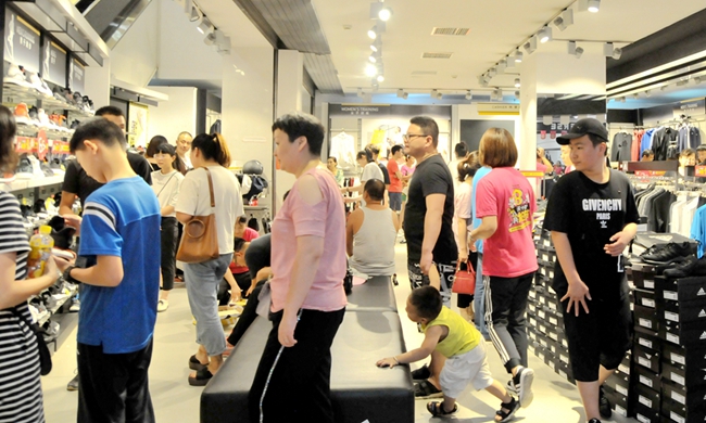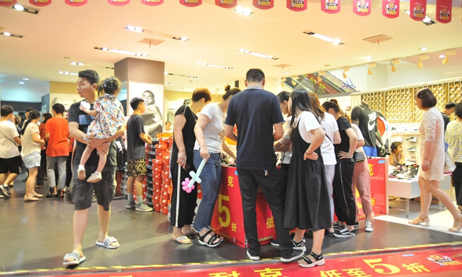 晚上7時,等候的人潮開始涌進商場,原本寬敞、靚麗的購物中心瞬間變得擁擠起來。放眼望去,商場通道內擠滿了來回穿梭的消費者,各大專柜內更是堆滿了琳瑯滿目的特價商品,人們幸福地挑選著商品,滿臉喜悅之情。